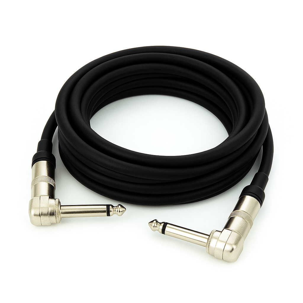 Com plugs metálicos em ângulo reto (90°), o cabo facilita a organização e reduz a tensão nas conexões, ideal para palcos, estúdios e setups compactos.